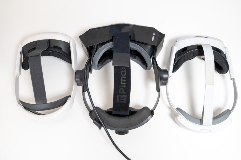 写真の通り、サイズ感はQuest3やPico4 Ulra と比べると一回り大きいです。しかし重量は同水準かつ、クッション部分や頭頂部のベルトが太いため、付け心地は良好です。ただし、Quest3やPico4 Ultra のようにフェイスクッション等の交換オプションの選択肢がないため、人によっては形が合わない可能性もあるでしょう。
