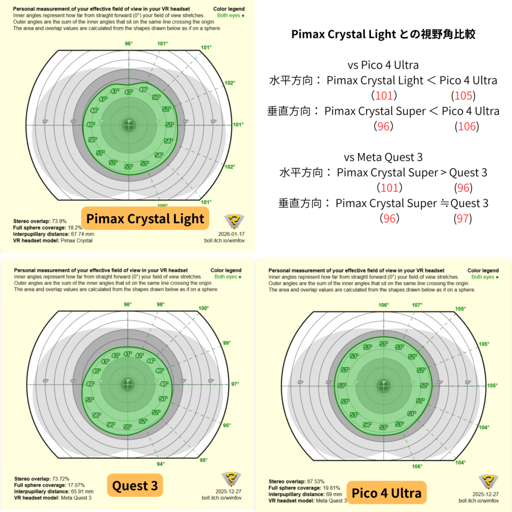 視野角は、Pico4 Ultra > Pimax Crystal Light > Quest3 でした。